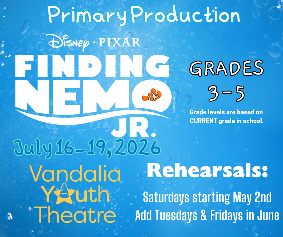 Our Primary cast welcomes students CURRENTLY in 3rd through 5th grade to audition for Finding Nemo